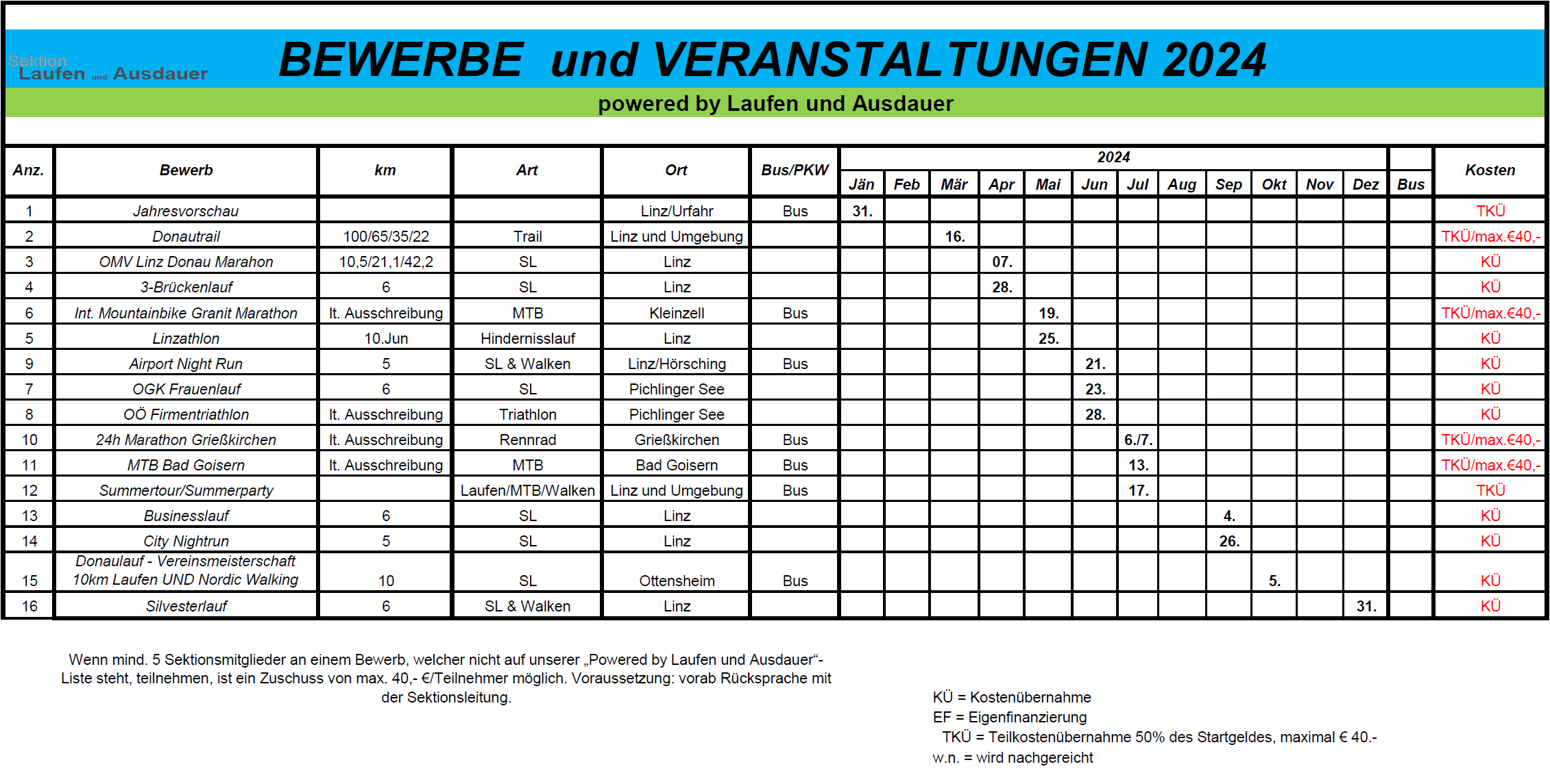 - Einmalige jährliche Rückvergütung von Startgeldern bei Veranstaltungen, die nicht im Veranstaltungskalender „powered by Sektion Laufen und Ausdauer“ angeführt sind UND bei Anmeldung von mind. 5 TeilnehmerInnen