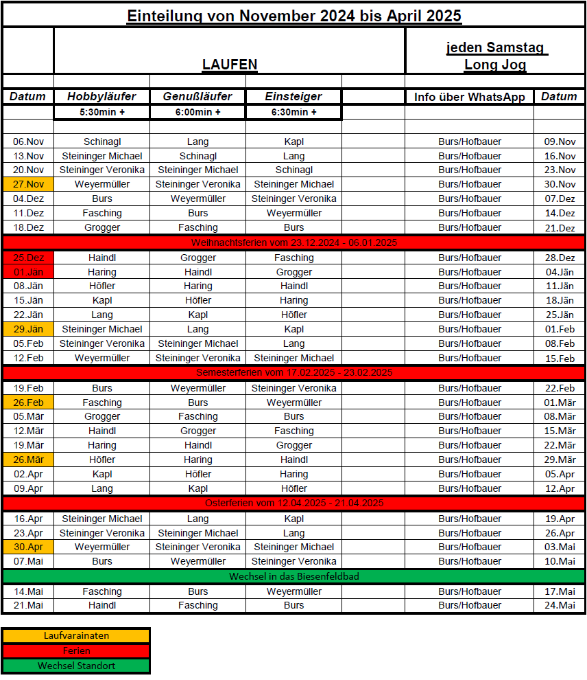 - Ganzjähriger, wöchentlicher Lauftreff (Mittwoch 17:00) mit verschiedenen